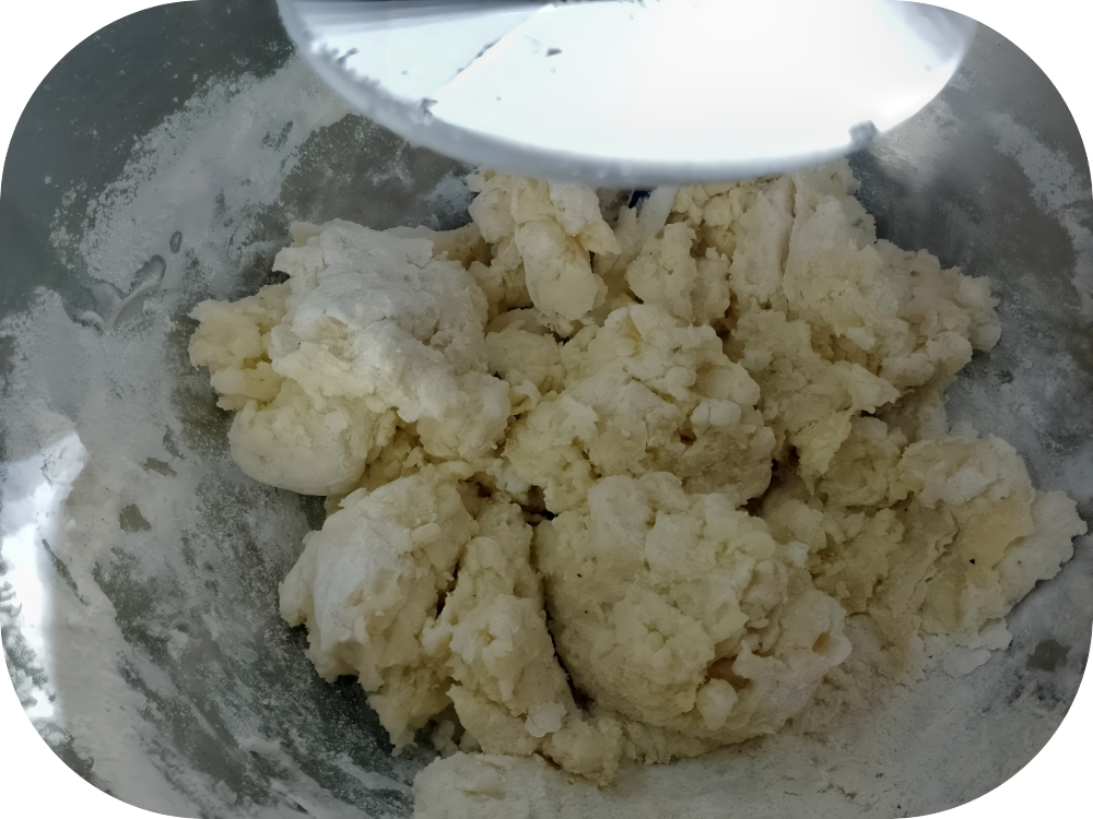 Mettre dans le pétrin les pommes de terre écrasées, les œufs, la farine, le sel et le poivre.