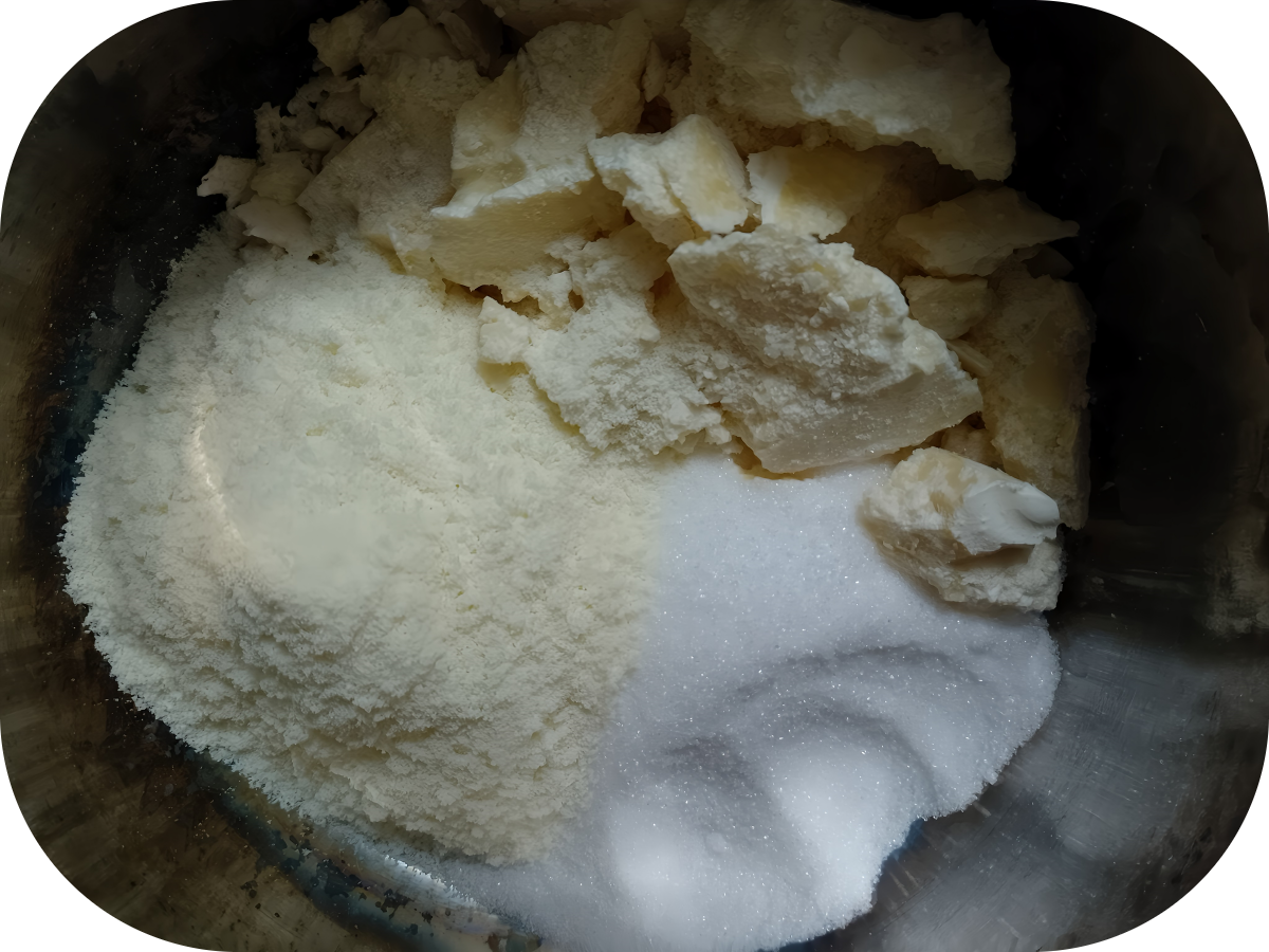 Mettere tutti gli ingredienti a bagnomaria e farli sciogliere a fuoco molto basso. Mescolare.