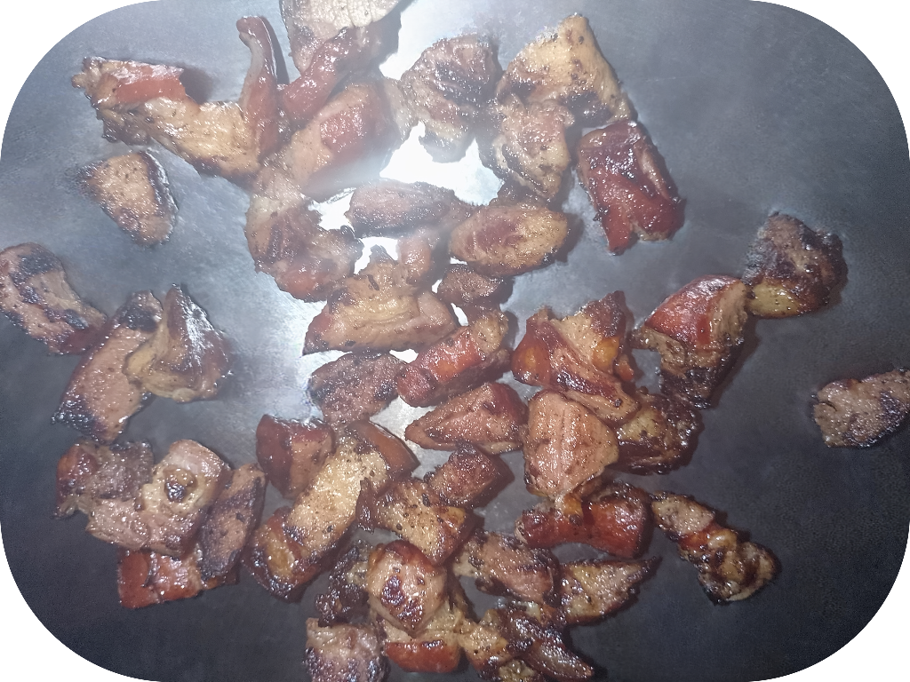 Soffriggere il guanciale a cubi (o la pancenta) in una padella, con un po' di olio di oliva. I salumi devono diventare ben dorati.