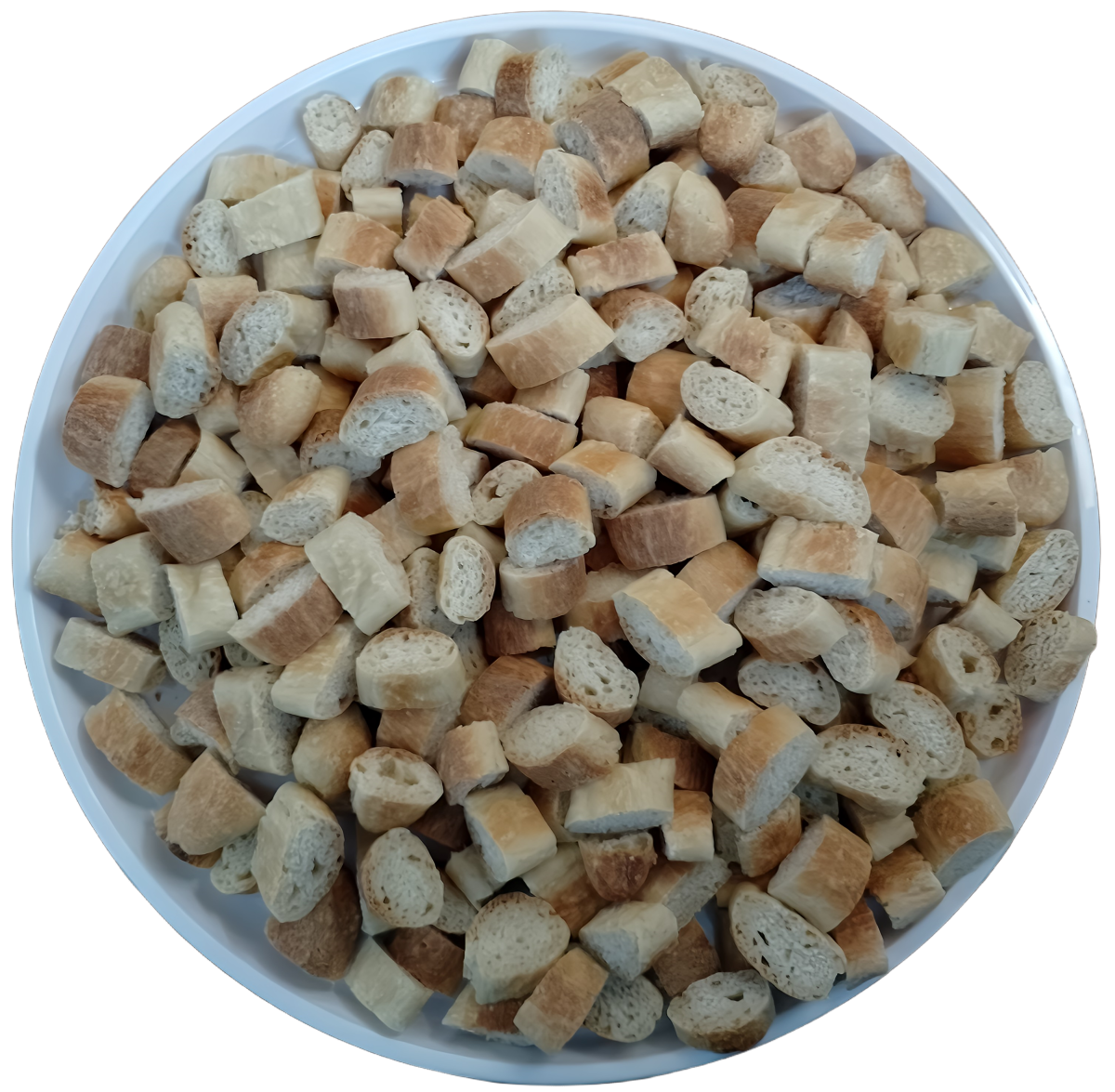 Couper le pain en cubes d'environ deux centimètres de côté. Le pain un peu sec convient mieux. Éviter le pain rond avec trop de mie et préférer la baguette.