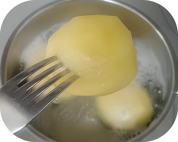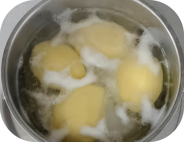 Faire cuire les pommes de terre pelées entières dans de l'eau salée durant vingt à trente minutes. Elles doivent rester fermes et tenir piquées au bout d'une fourchette