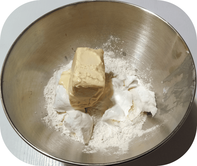 Mettre dans un saladier les « petits-suisses », la farine et le beurre mou (mais pas fondu) et une pincée de sel.