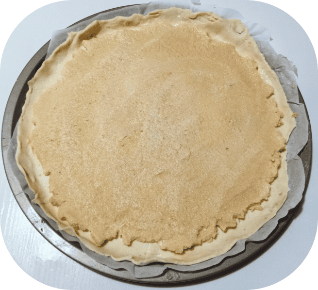 Disporre, su una teglia rivestita di carta fa forno, il primo disco, e spalmare la frangipane, lasciando libero un bordo di due centimetri.