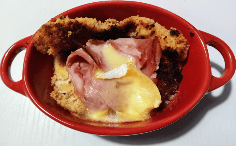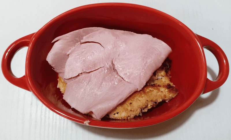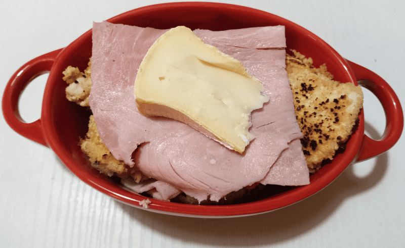 Disposer les escalopes dans un plat, ajouter le jambon et le reblochon.